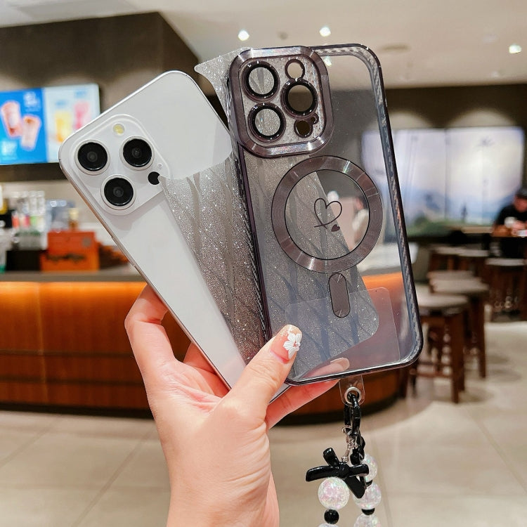 For iPhone 15 Pro Loves Leaves Gradient Glitter Bracelets Carbon Fiber Magsafe TPU Phone Case(Gold)