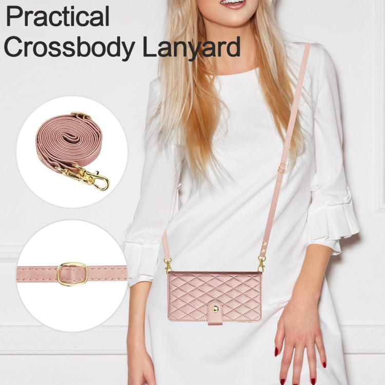 For iPhone 15 Pro YM016 Rhombic Zipper Card Wallet Leather Phone Case with Lanyard(Rose Gold)