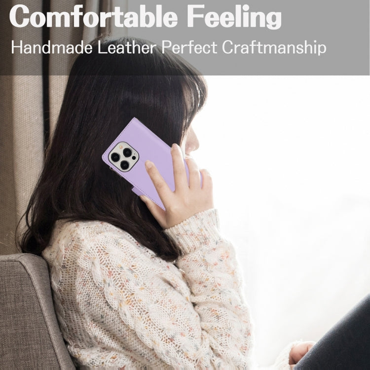 For iPhone 15 YM016 Rhombic Zipper Card Wallet Leather Phone Case with Lanyard(Light Purple)