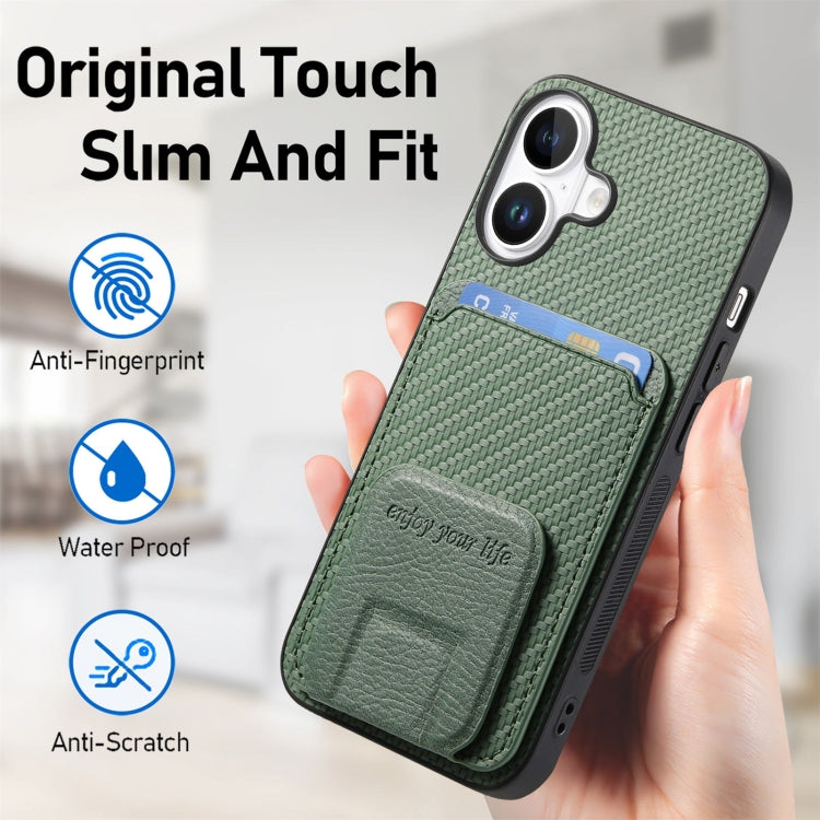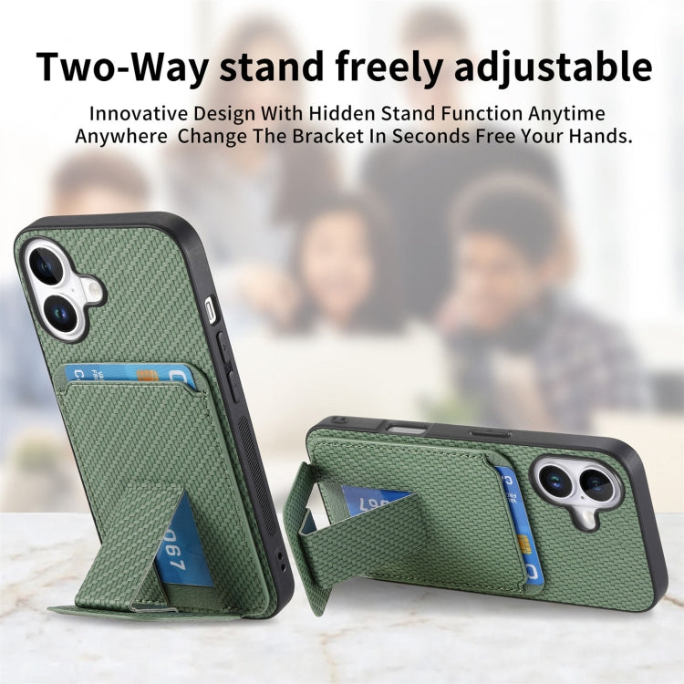 For iPhone 16 Carbon Fiber Card Bag Fold Stand Phone Case(Green)
