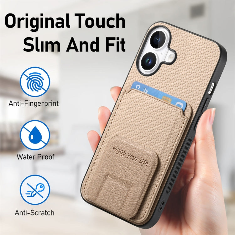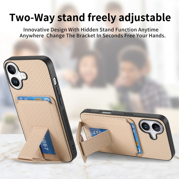 For iPhone 16 Carbon Fiber Card Bag Fold Stand Phone Case(Khaki)