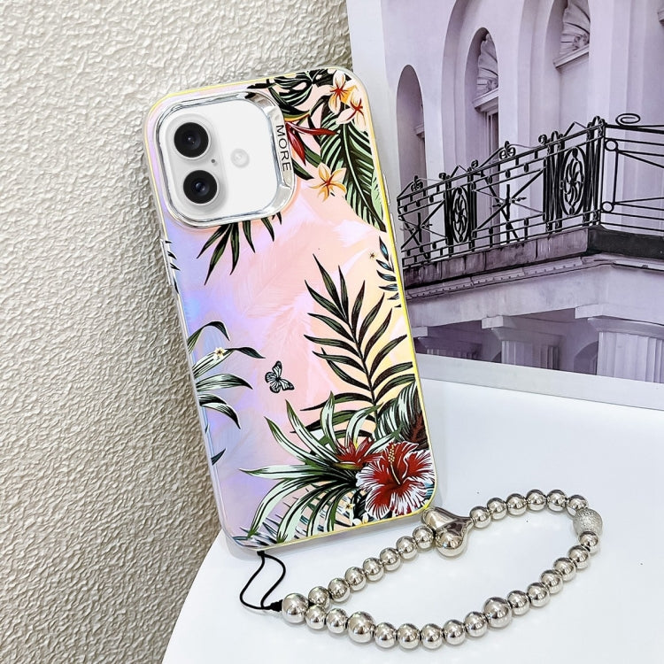 For iPhone 16 Electroplating Laser Flower Phone Case with Wrist Strap(Leaves AH12)