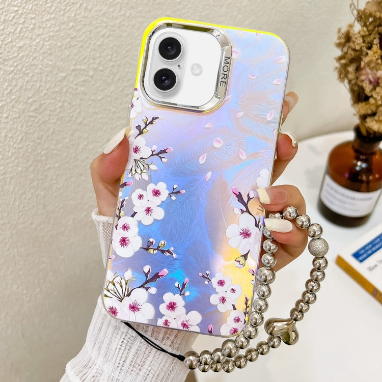 For iPhone 16 Electroplating Laser Flower Phone Case with Wrist Strap(Plum Blossom AH18)