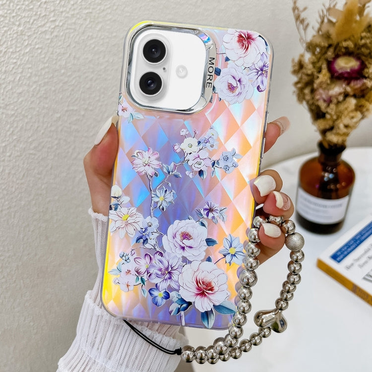 For iPhone 16 Electroplating Laser Flower Phone Case with Wrist Strap(Rose AH15)
