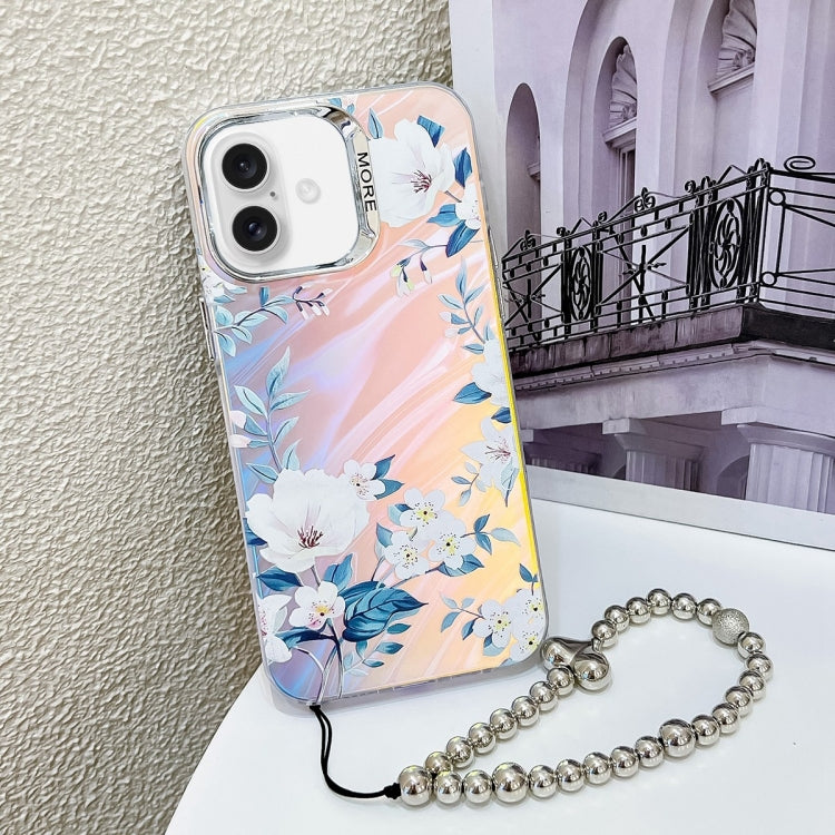 For iPhone 16 Electroplating Laser Flower Phone Case with Wrist Strap(White Flower AH10)