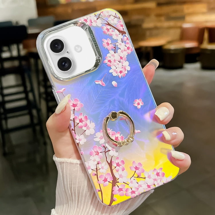 For iPhone 16 Electroplating Laser Flower Ring Holder TPU Phone Case(Peach Blossom AH4)