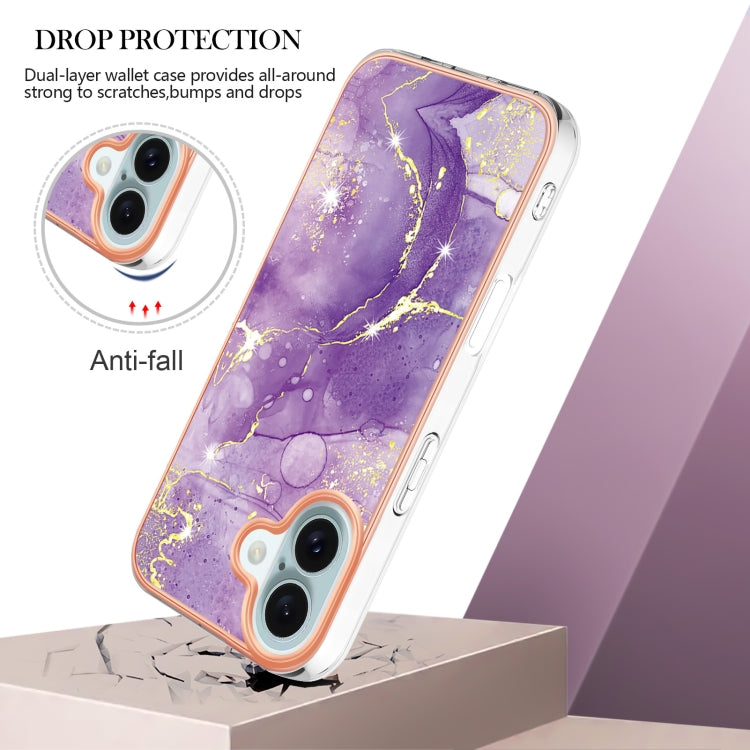 For iPhone 16 Electroplating Marble Pattern Dual-side IMD TPU Shockproof Phone Case (Purple 002)