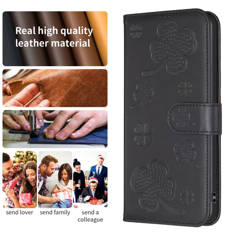 For iPhone 16 Four-leaf Embossed Leather Phone Case(Black)