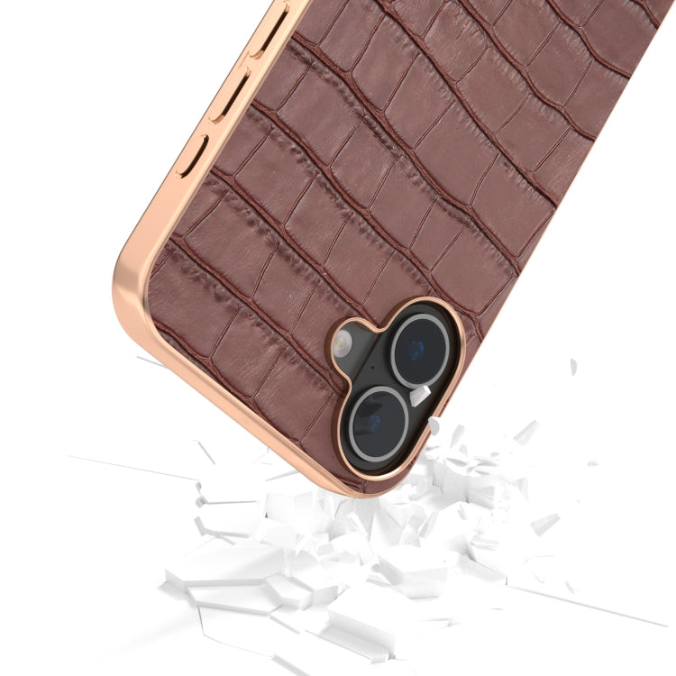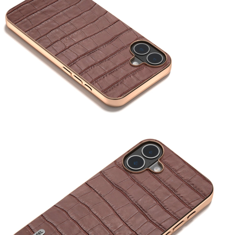 For iPhone 16 Plus ABEEL Electroplating Frame Crocodile Texture Genuine Leather Phone Case(Brown)