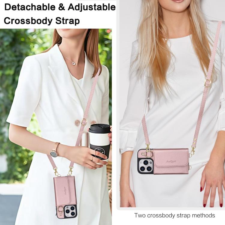 For iPhone 16 Plus AwQuer 2 in 1 Crossbody Wallet Leather Back Phone Case(Rose Gold)