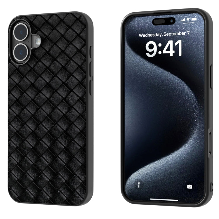 For iPhone 16 Plus Black Frame Woven Texture PU Phone Case(Black)