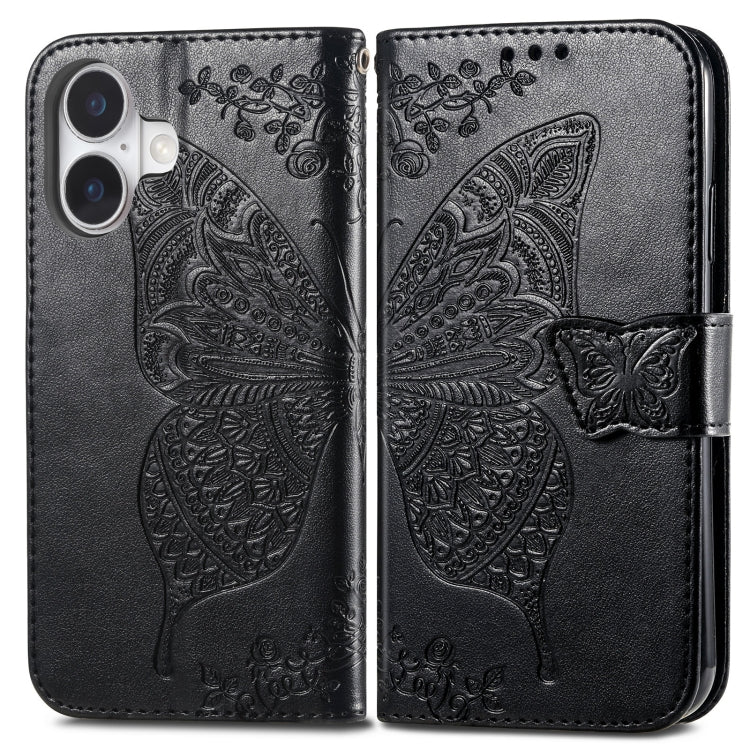 For iPhone 16 Plus Butterfly Love Flower Embossed Leather Phone Case(Black)