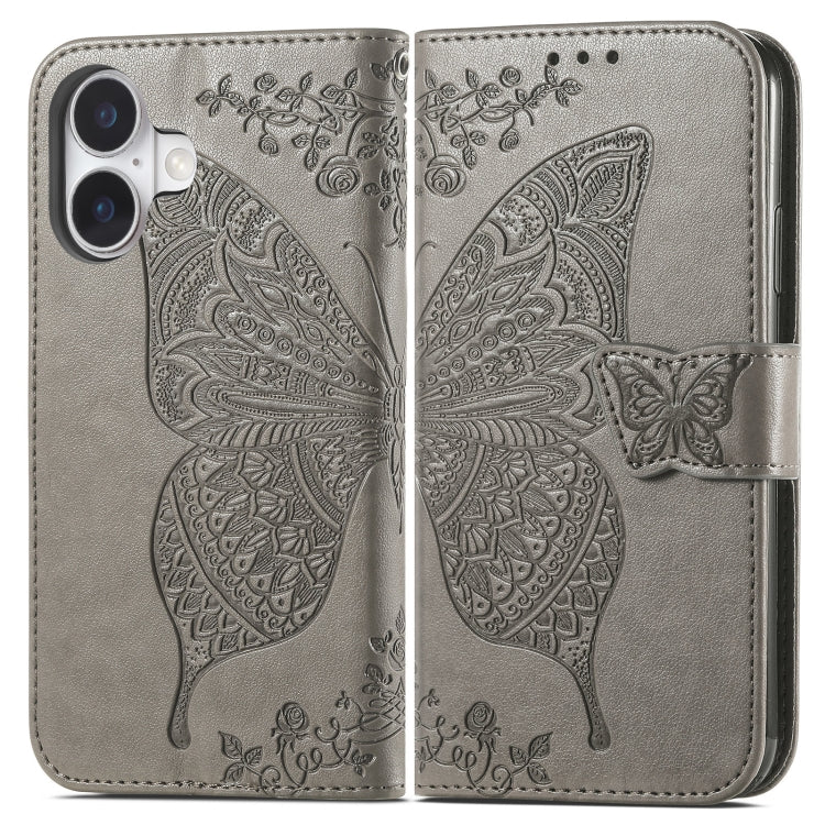 For iPhone 16 Plus Butterfly Love Flower Embossed Leather Phone Case(Gray)