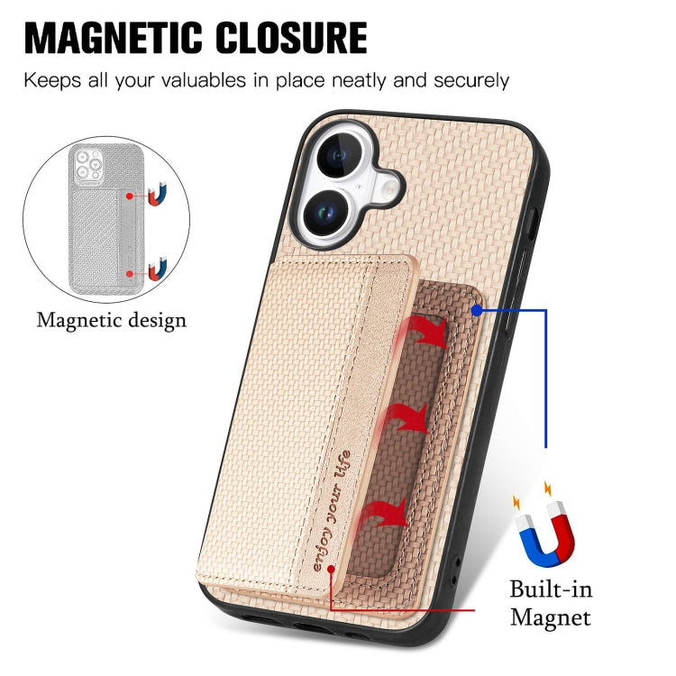 For iPhone 16 Plus Carbon Fiber Magnetic Card Wallet RFID Blocking Phone Case(Khaki)