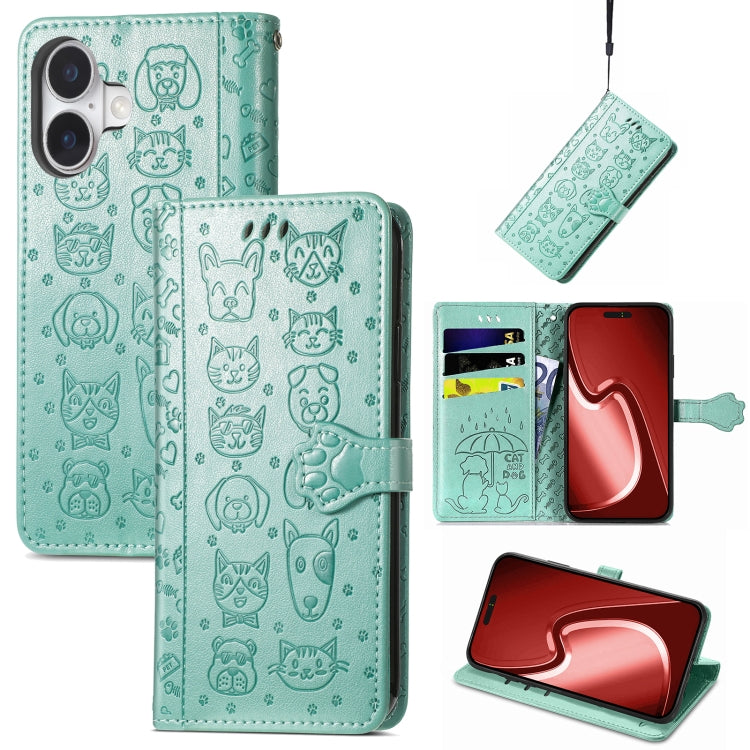 For iPhone 16 Plus Cat and Dog Embossed Leather Phone Case(Green)