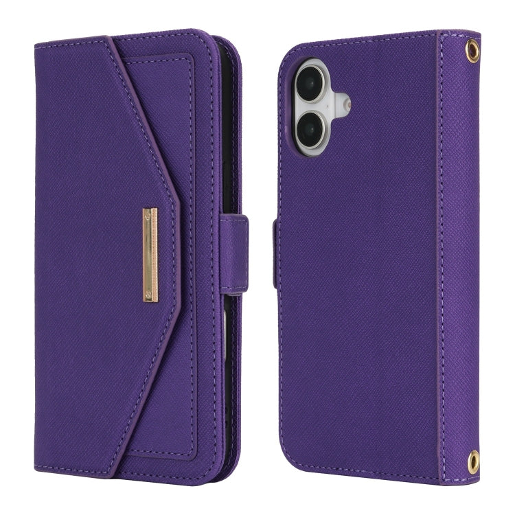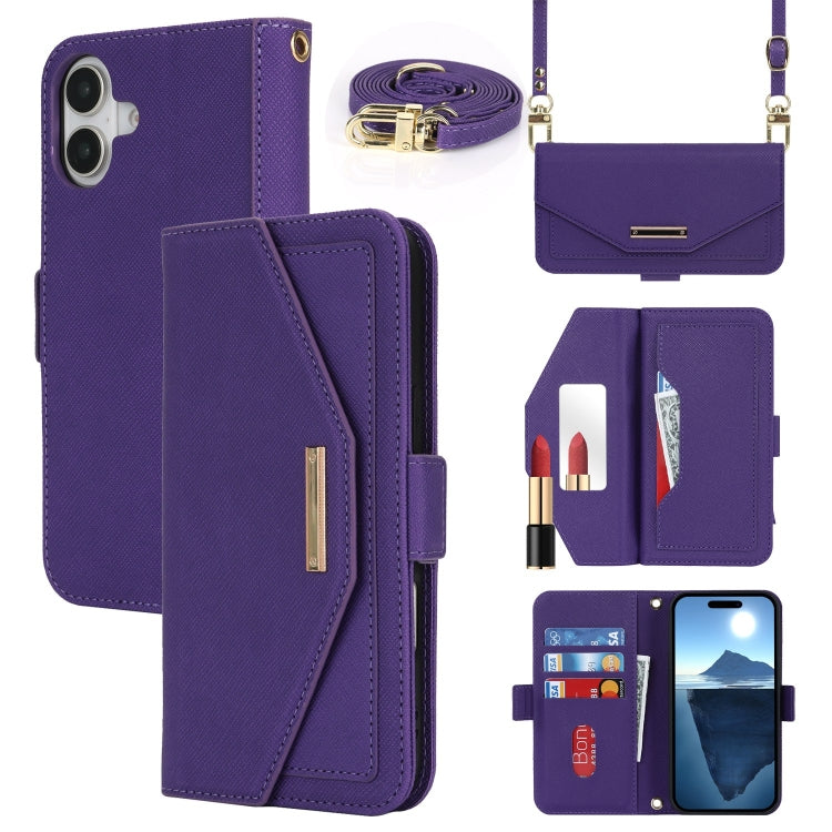 For iPhone 16 Plus Cross Texture Crossbody Lanyard Leather Phone Case(Purple)