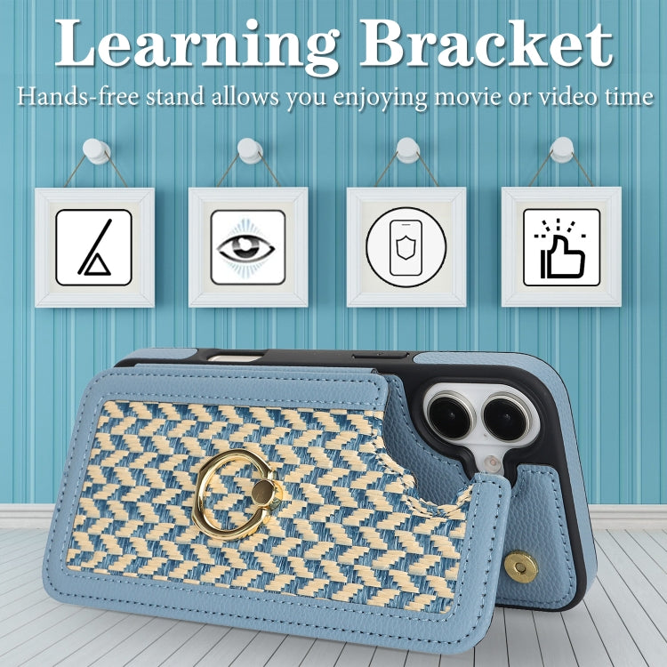 For iPhone 16 Plus Double Bckle Card Slot Full Coverage Phone Case with Cross-body Strap(Blue)