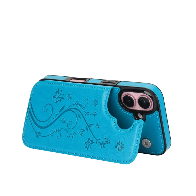 For iPhone 16 Plus Double Buckle Butterfly Embossing PU Phone Case(Blue)