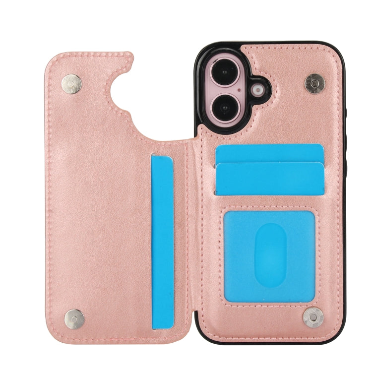 For iPhone 16 Plus Double Buckle Butterfly Embossing PU Phone Case(Rose Gold)