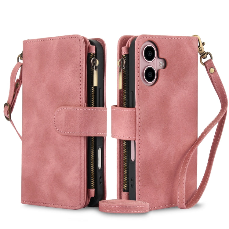 For iPhone 16 Plus Dream 9-Card Zipper Wallet RFID Leather Phone Case with Lanyard(Rose Gold)