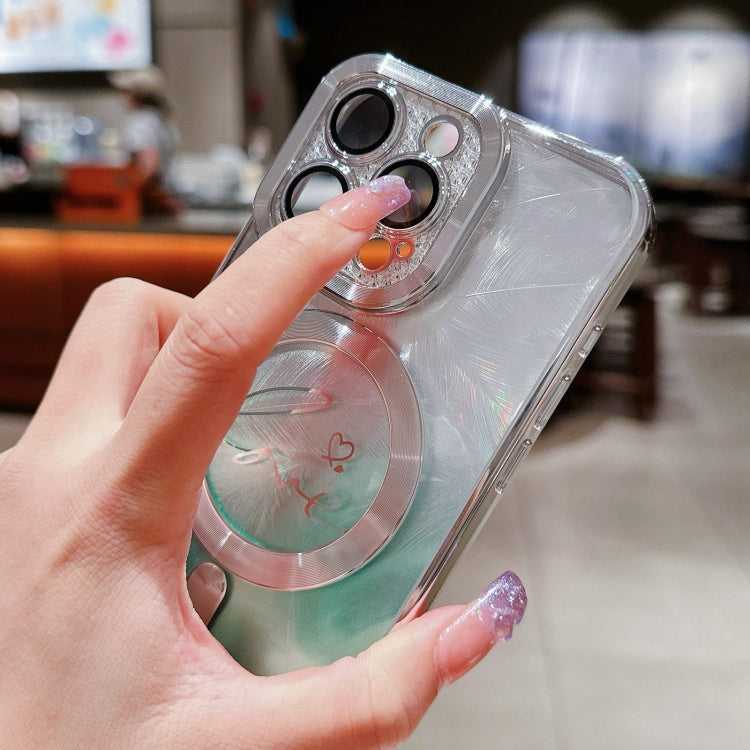 For iPhone 16 Plus Dual-Love Feather Gradient Glitter Bracelets Magsafe TPU Phone Case(Black)