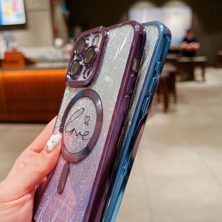 For iPhone 16 Plus Dual-Love Leaves Gradient Glitter Bracelets Magsafe TPU Phone Case(Purple)