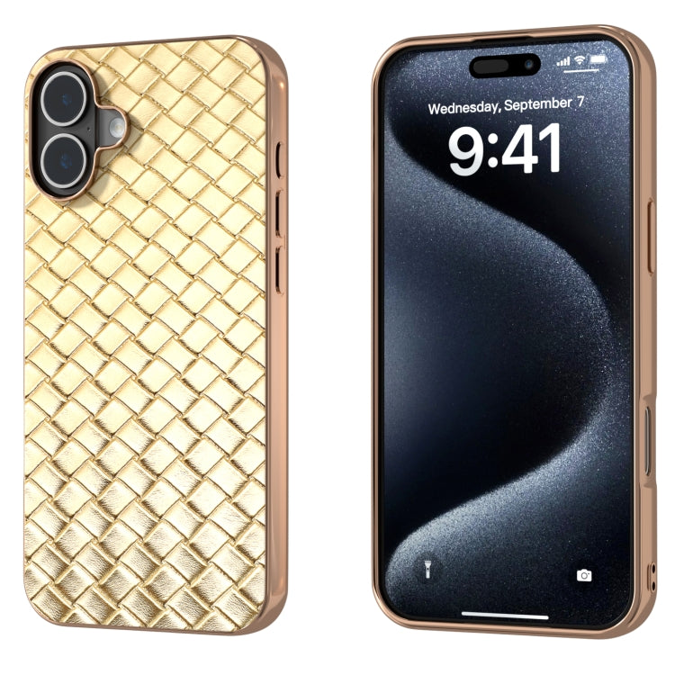 For iPhone 16 Plus Electroplated Frame Woven Texture PU Phone Case(Gold)