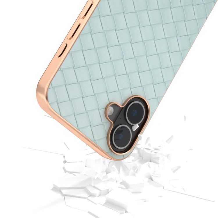 For iPhone 16 Plus Electroplated Frame Woven Texture PU Phone Case(Light Green)