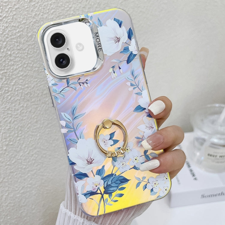 For iPhone 16 Plus Electroplating Laser Flower Ring Holder TPU Phone Case(White Flower AH10)