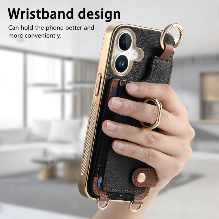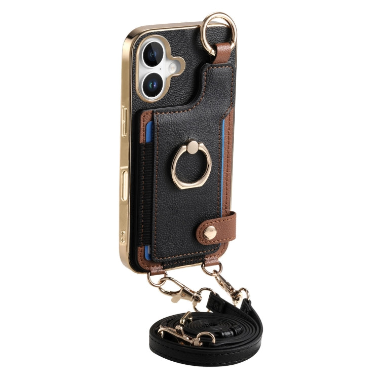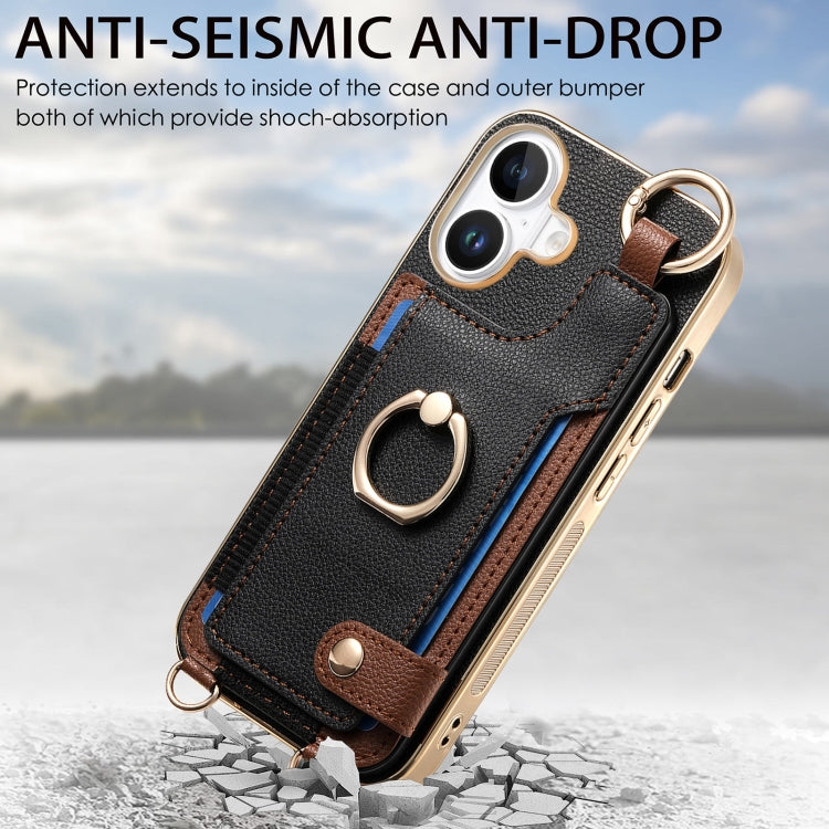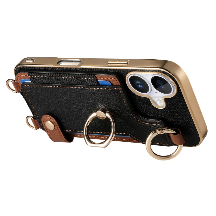 For iPhone 16 Plus Fashion Ring Card Bag Phone Case with Hang Loop(Black)