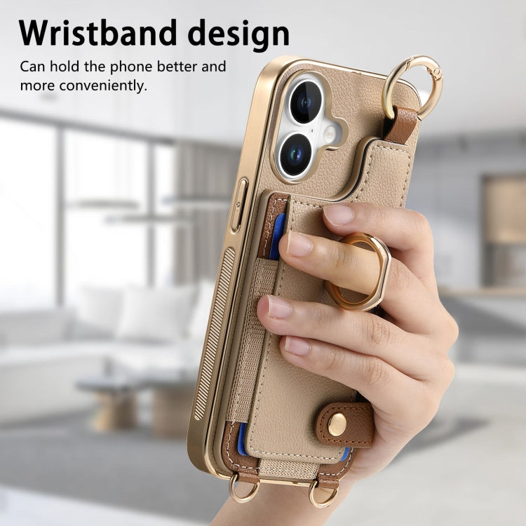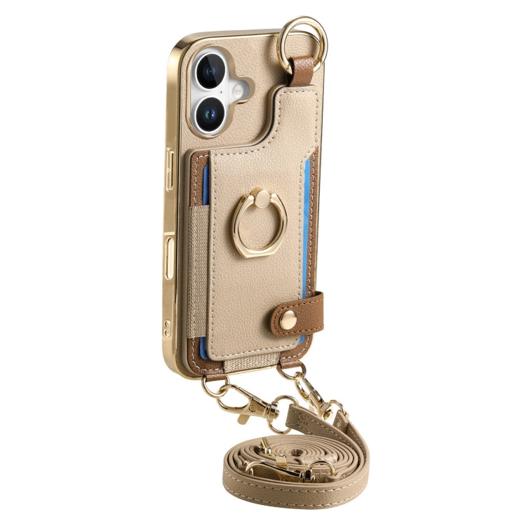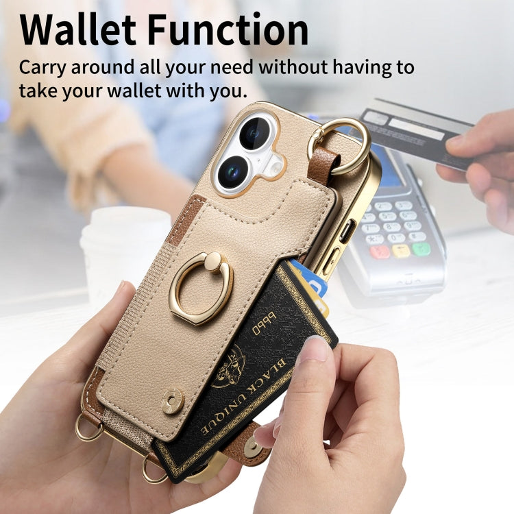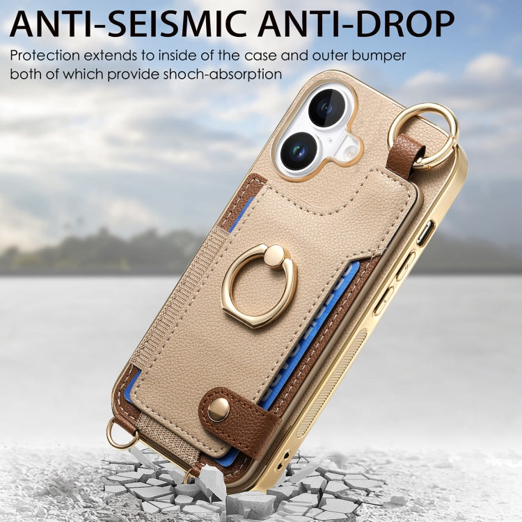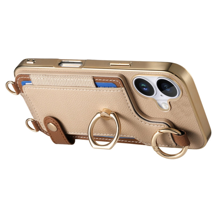 For iPhone 16 Plus Fashion Ring Card Bag Phone Case with Hang Loop(Khaki)
