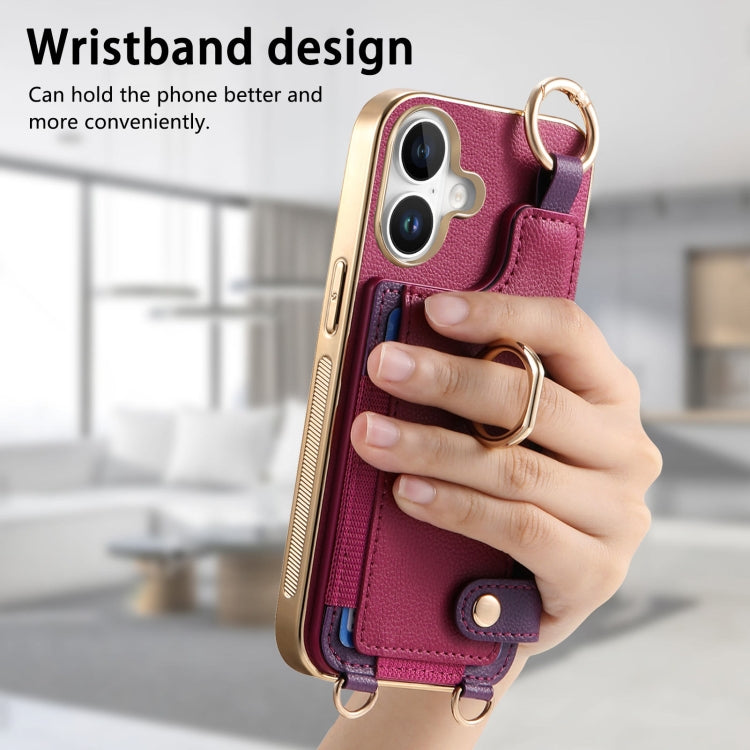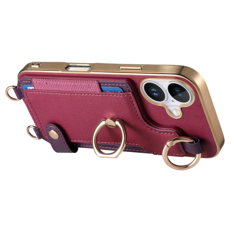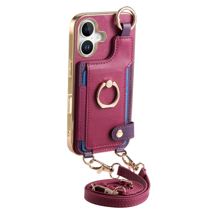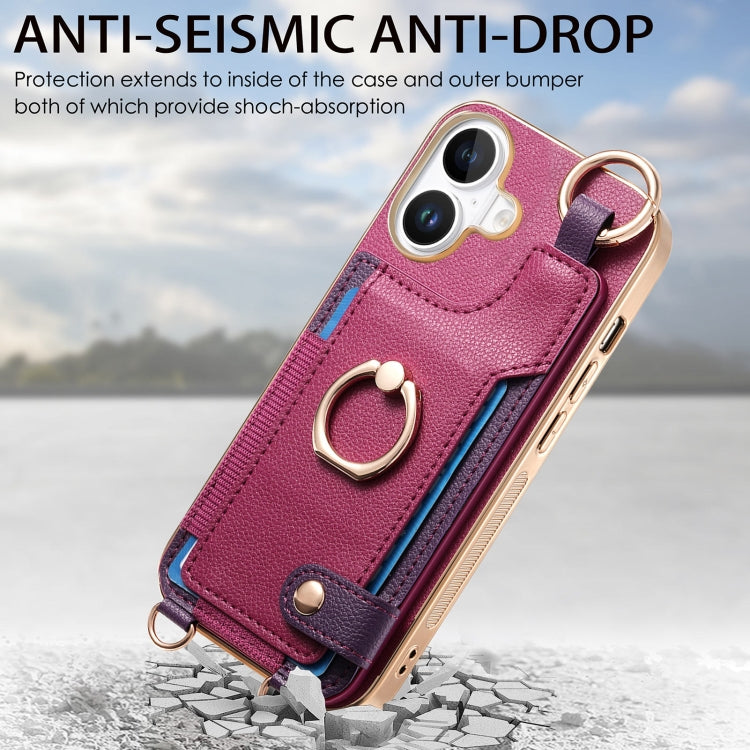 For iPhone 16 Plus Fashion Ring Card Bag Phone Case with Hang Loop(Purple)