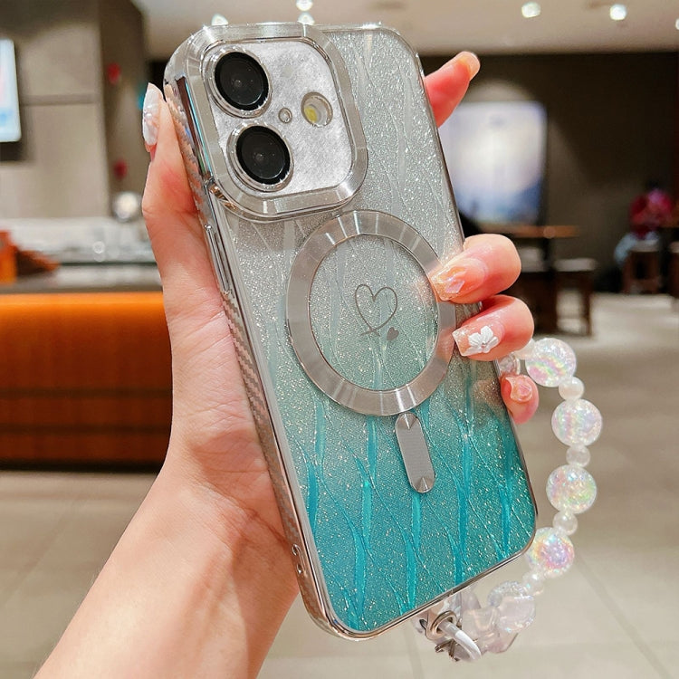For iPhone 16 Plus Loves Leaves Gradient Glitter Bracelets Carbon Fiber Magsafe TPU Phone Case(Green)