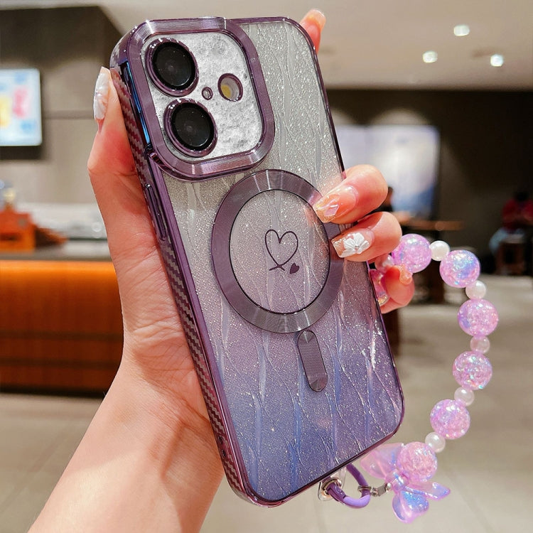 For iPhone 16 Plus Loves Leaves Gradient Glitter Bracelets Carbon Fiber Magsafe TPU Phone Case(Purple)