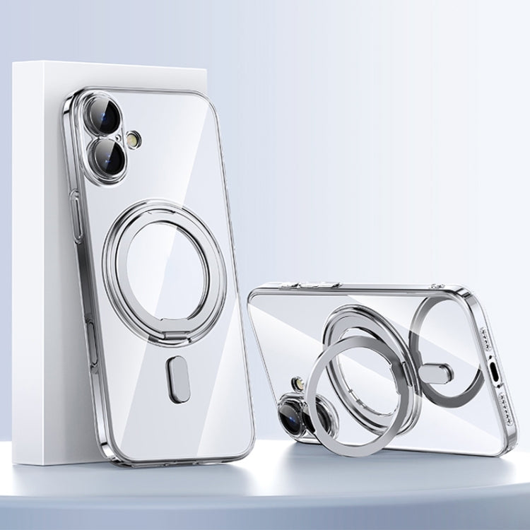For iPhone 16 Plus Plating PC 360 Ring Holder Magsafe Phone Case(Clear Sliver)