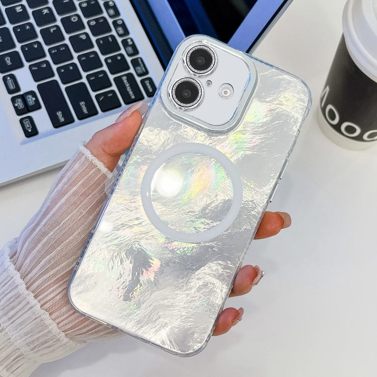 For iPhone 16 Plus Plating Texture MagSafe TPU Phone Case with Glitter Lens Film(White Tinfoil Texture)