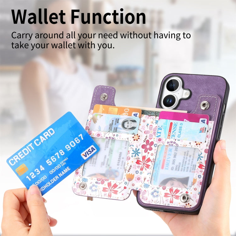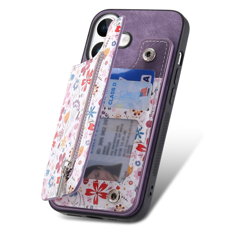 For iPhone 16 Plus Retro Painted Zipper Wallet Back Phone Case(Purple)
