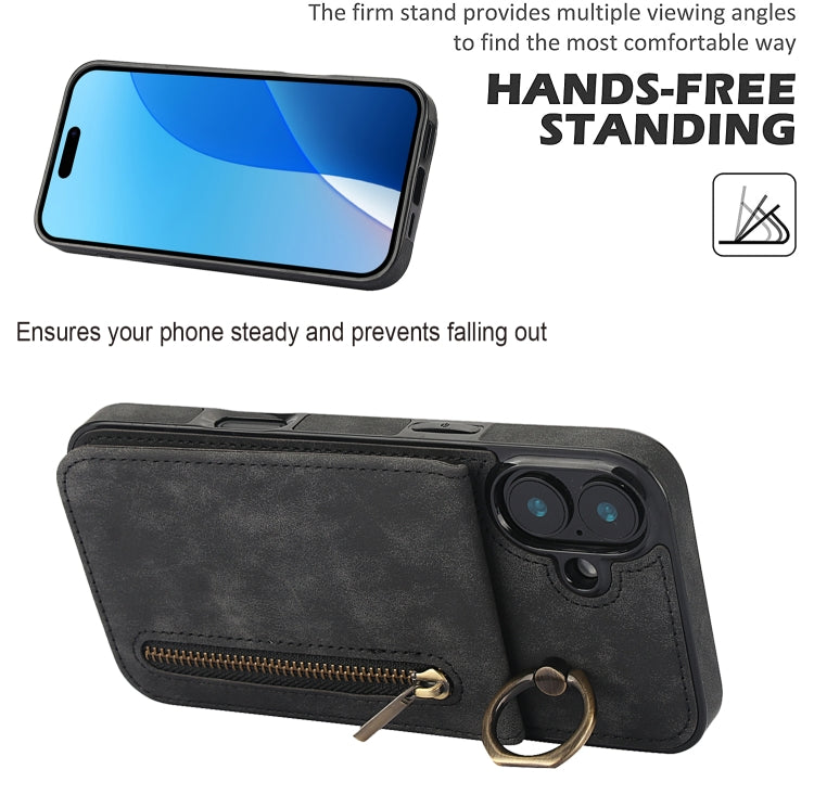 For iPhone 16 Plus Retro Ring and Zipper RFID Card Slot Phone Case(Black)