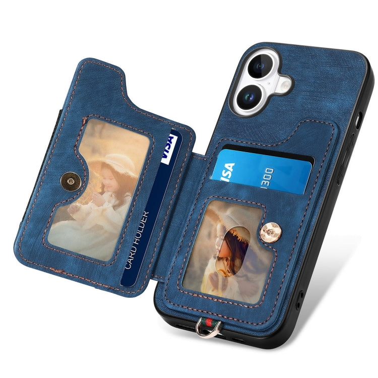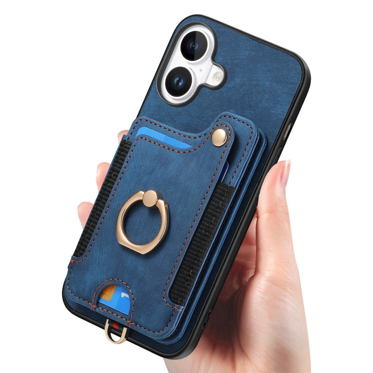 For iPhone 16 Plus Retro Skin-feel Ring Multi-card Wallet Phone Case(Blue)