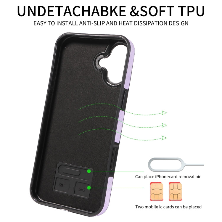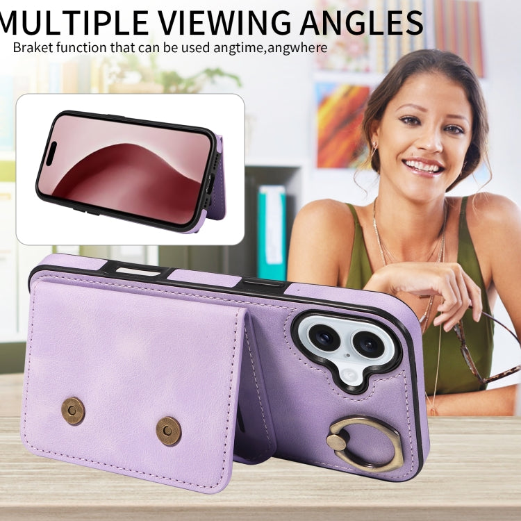 For iPhone 16 Plus Skin Feel Card Bag Phone Case with Ring Buckle(Purple)