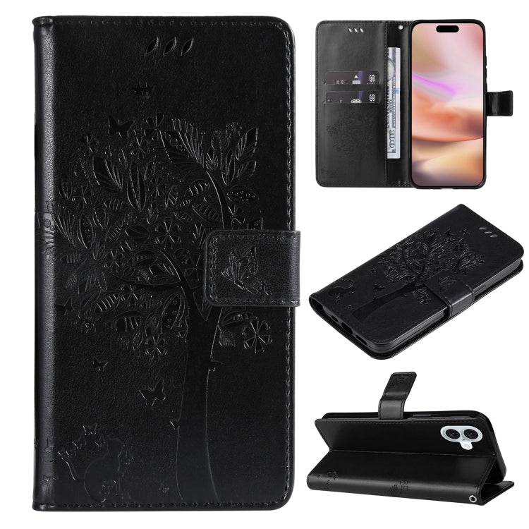 For iPhone 16 Plus Tree & Cat Embossed Pattern Flip Leather Phone Case(Black)