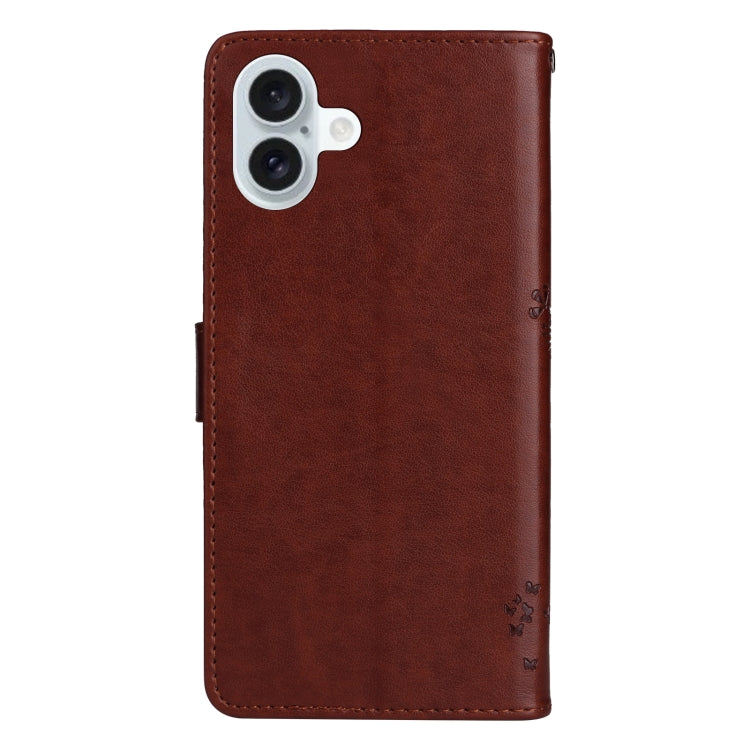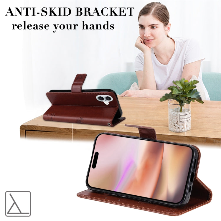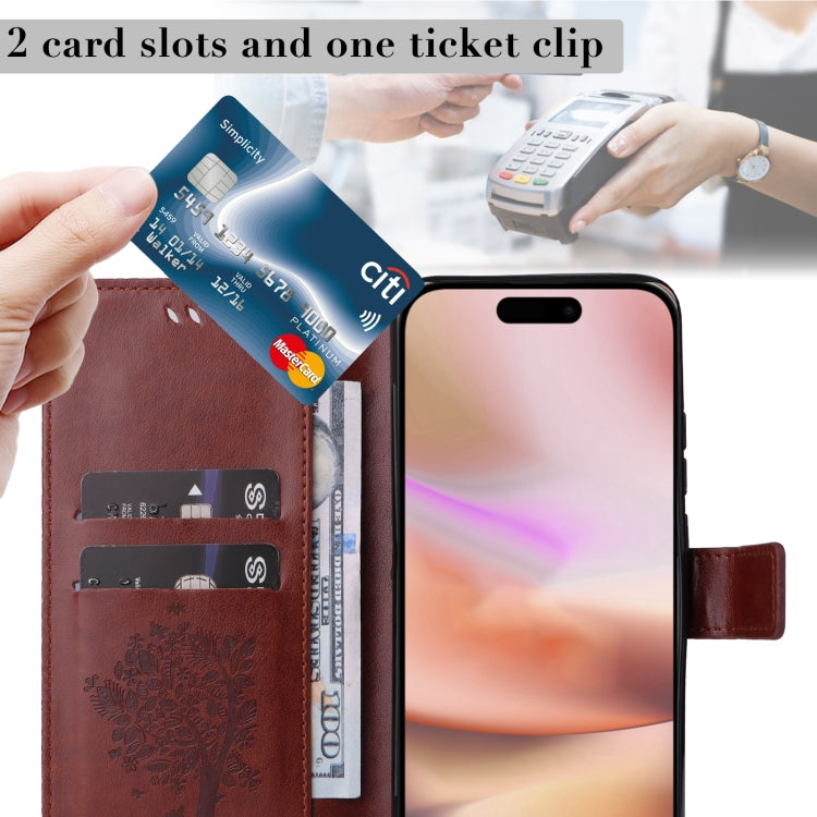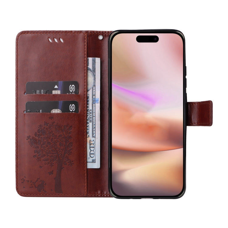 For iPhone 16 Plus Tree & Cat Embossed Pattern Flip Leather Phone Case(Coffee)