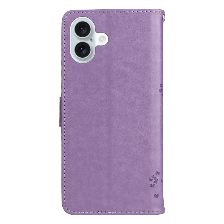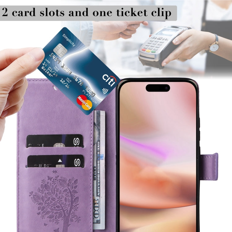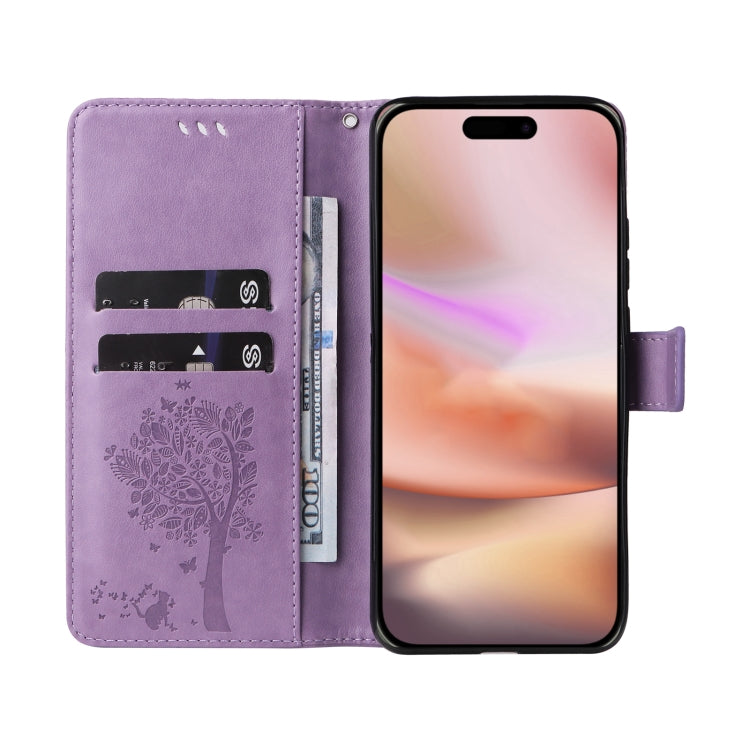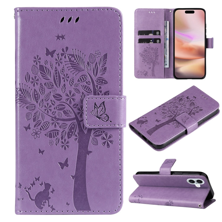 For iPhone 16 Plus Tree & Cat Embossed Pattern Flip Leather Phone Case(Light Purple)