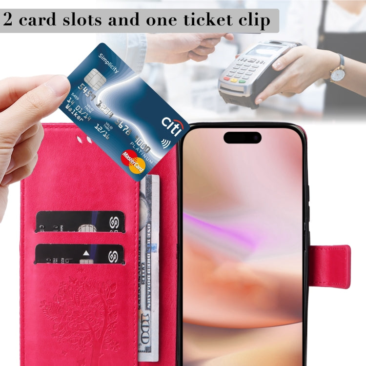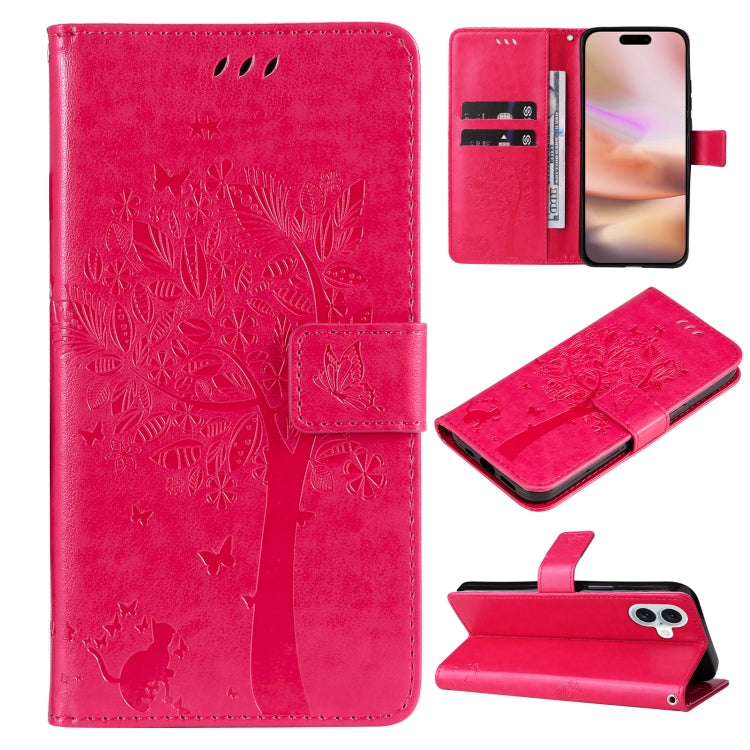 For iPhone 16 Plus Tree & Cat Embossed Pattern Flip Leather Phone Case(Rose Red)