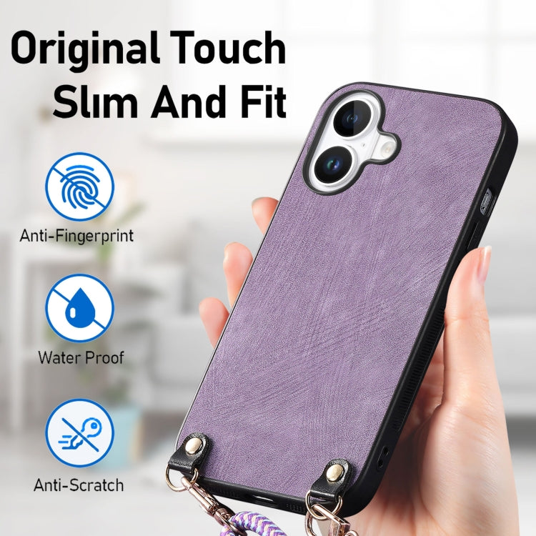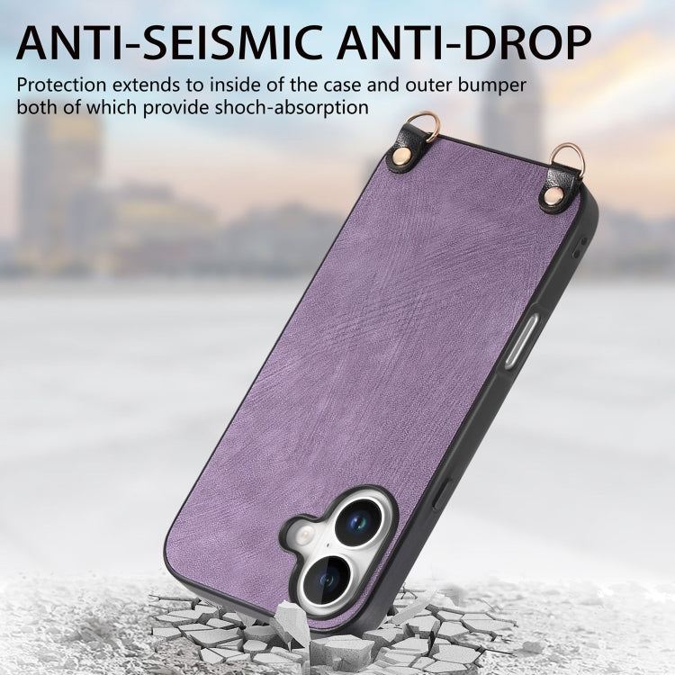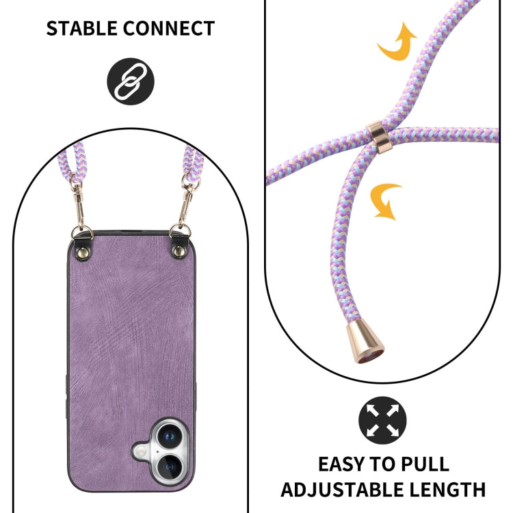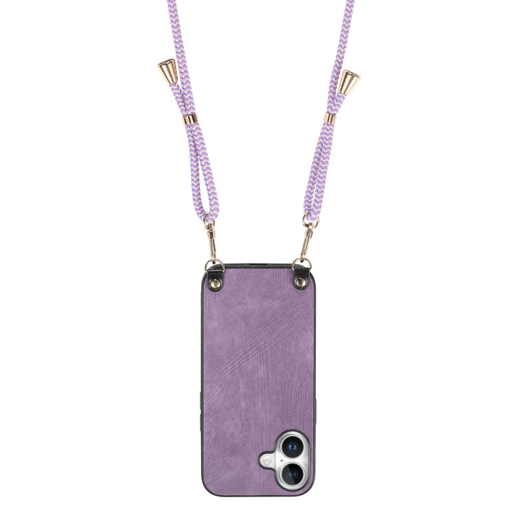 For iPhone 16 Plus Vintage Leather PC Back Cover Phone Case with Crossbody Strap(Purple)