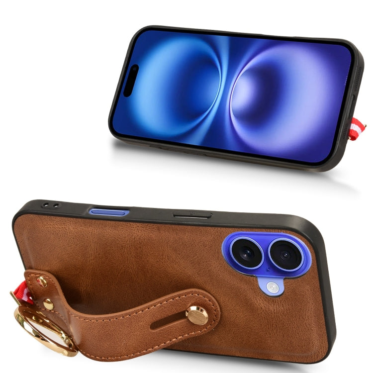 For iPhone 16 Plus Wristband Leather Back Phone Case(Brown)