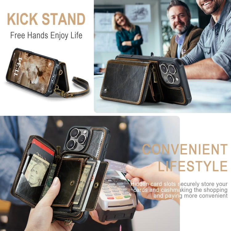 For iPhone 16 Pro Max JEEHOOD C22 Series Zipper Wallet Leather Phone Case with Dual Lanyard(Coffee)