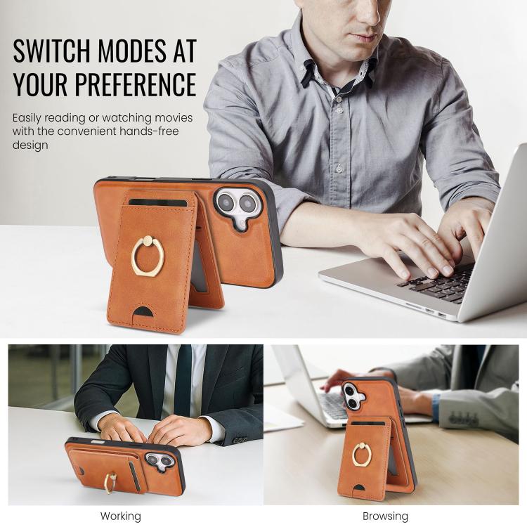 For iPhone 17 Kalebol Strong MagSafe Ring Magnetic Card Bag Holder Leather Phone Case(Brown)