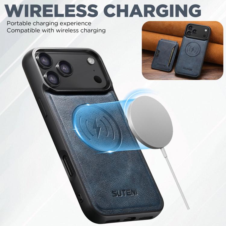 For iPhone 17 Pro Suteni M3 Card Bag MagSafe Cowhide Texture Leather Phone Case(Blue)