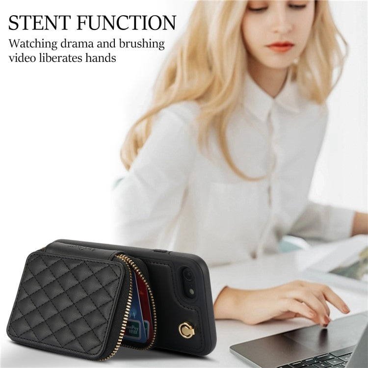 For iPhone 7 / 8 / SE 2022 AwQuer Crossbody Zipper Wallet Rhombic Leather Back Phone Case(Black)